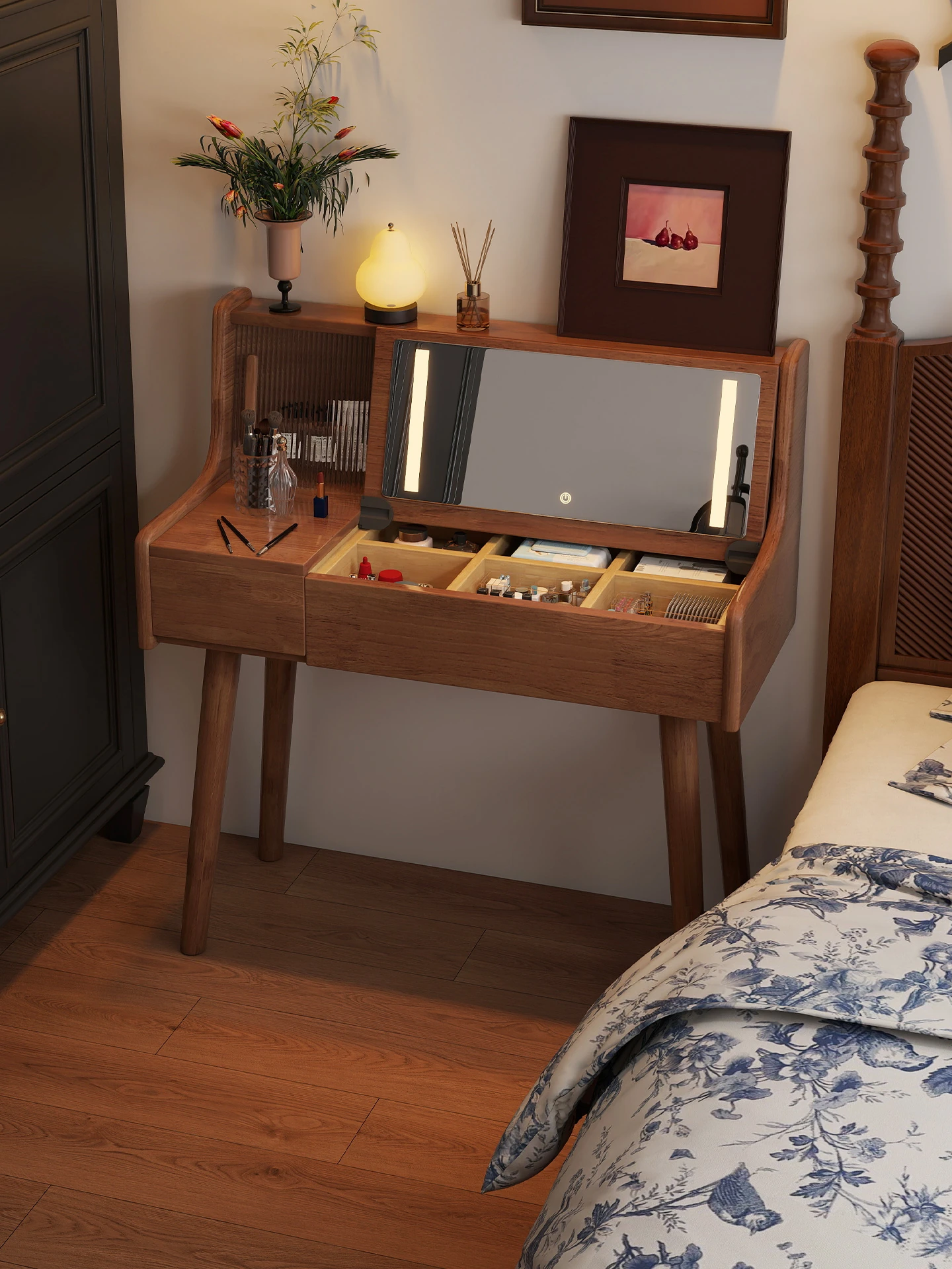 アンティーク風の全木製ドレッサー - 小型ベッドルームにぴったりのコスメテーブル一体型、ミラー付きで美しさを引き立てる!おしゃれで機能的な収納スペースを実現した、あなたのメイクアップタイムを特別にするアイテムです。