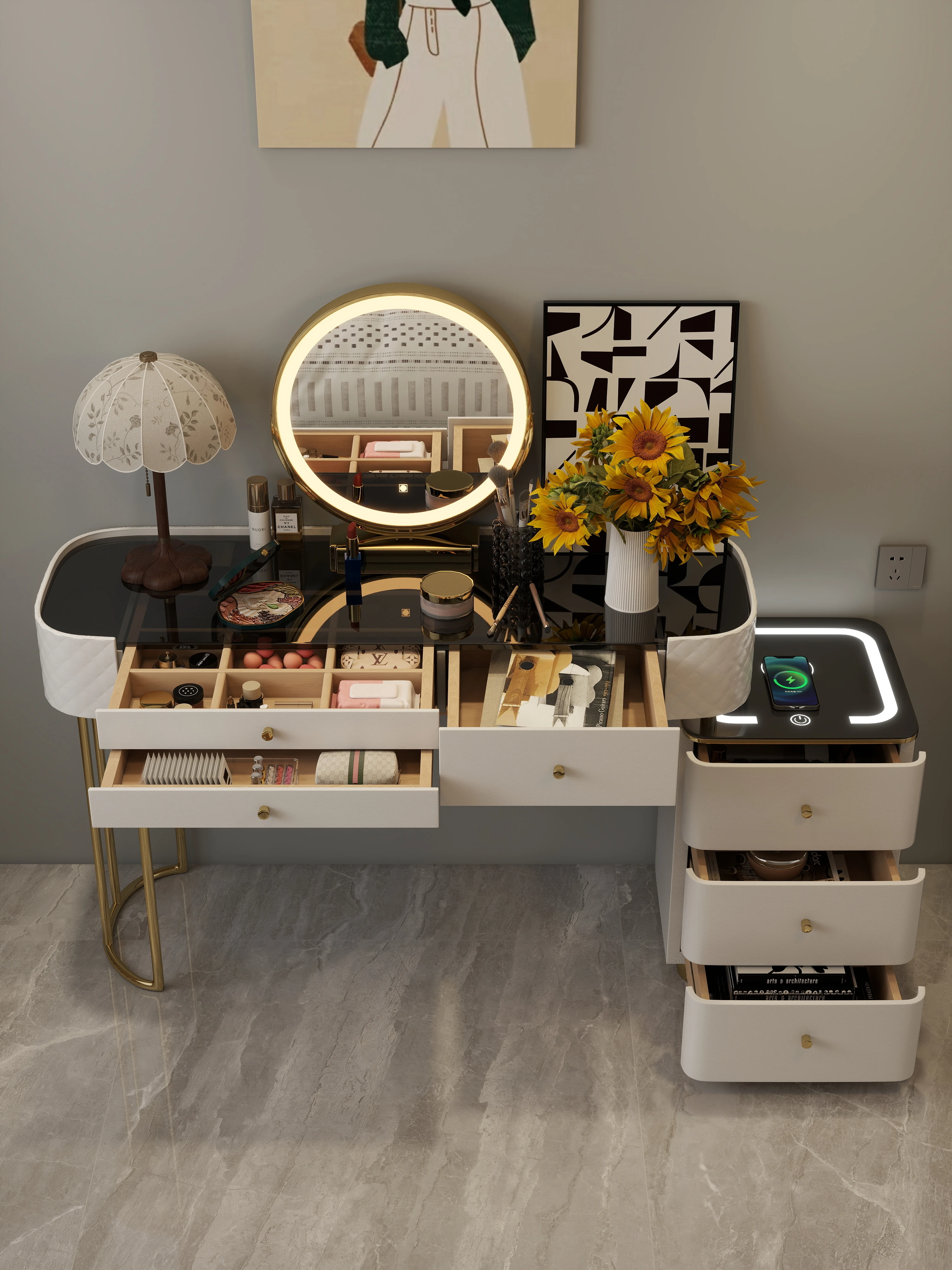 北欧スタイルの多機能化粧台 - スマートで洗練されたデザインの軽奢コスメテーブル。主寝室にぴったりの収納力抜群のドレッサー、書斎としても使える高級感あふれる一体型!