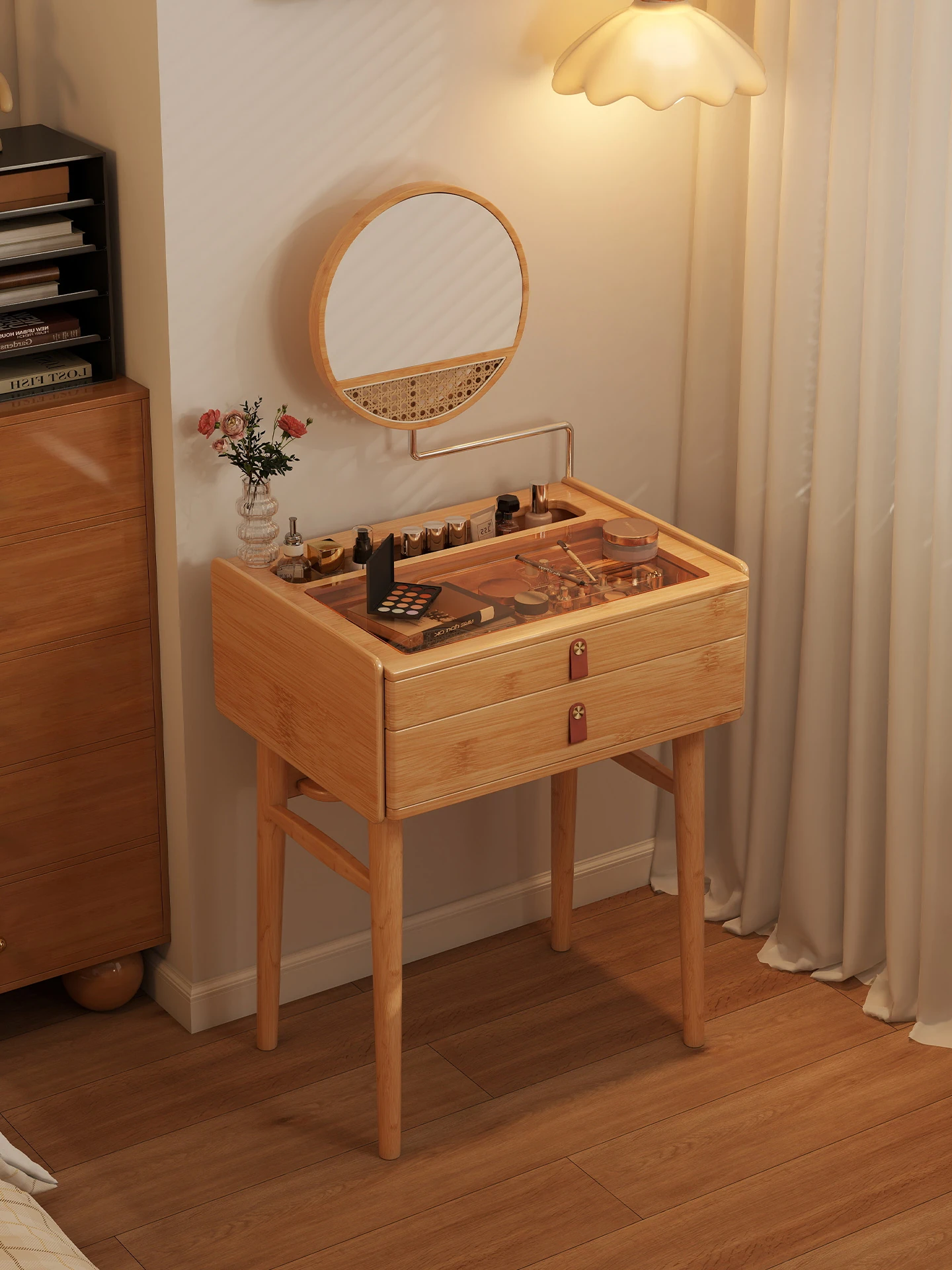天然楠竹製の和風メイクアップデスク一体型ミラーキャビネット - 小型60CM、コンパクトなラタン編みガラス化粧台兼用デスクで、おしゃれな空間を演出!収納力抜群で小さなお部屋にもぴったり!