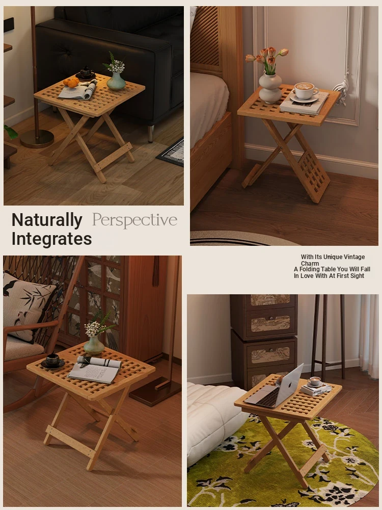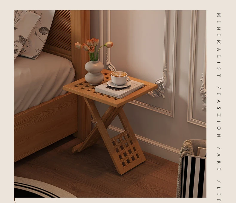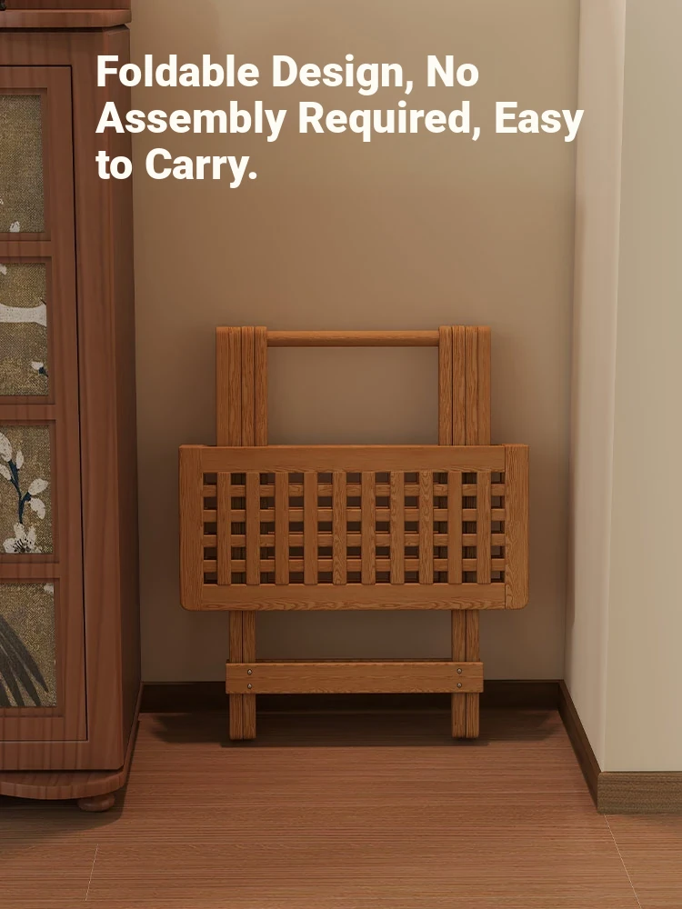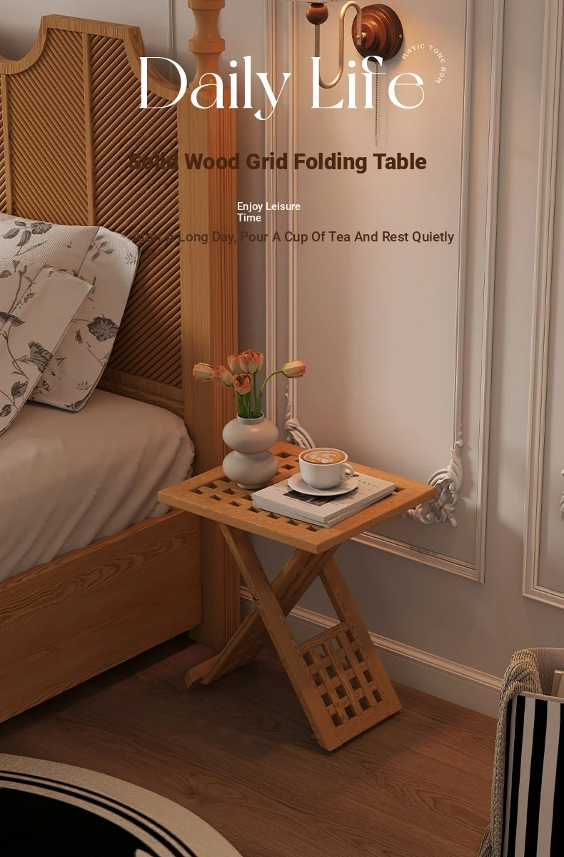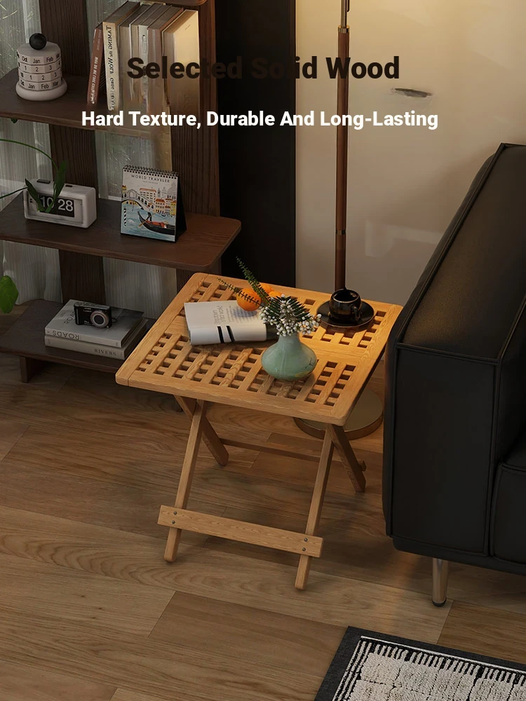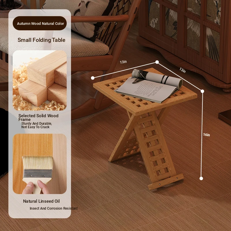 Rustic Solid Wood Folding Table - Portable Grid Tea Table for Bedroom, Simple Nightstand, and Balcony, Ideal Small Tea Desk for Cozy Spaces
