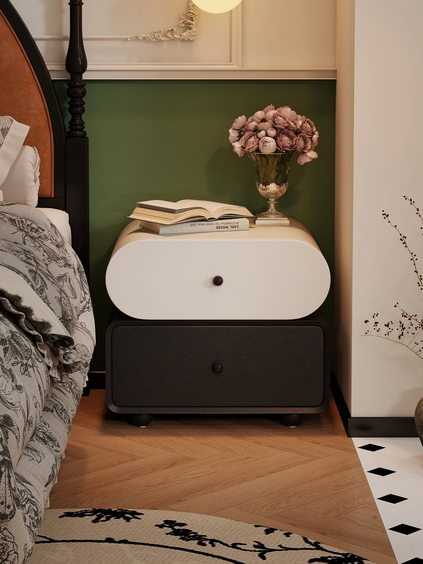 Creative Rotating Nightstand - French Vintage Solid Wood Bedside Cabinet with Luxurious Leather Finish for Stylish Bedroom Storage Solutions