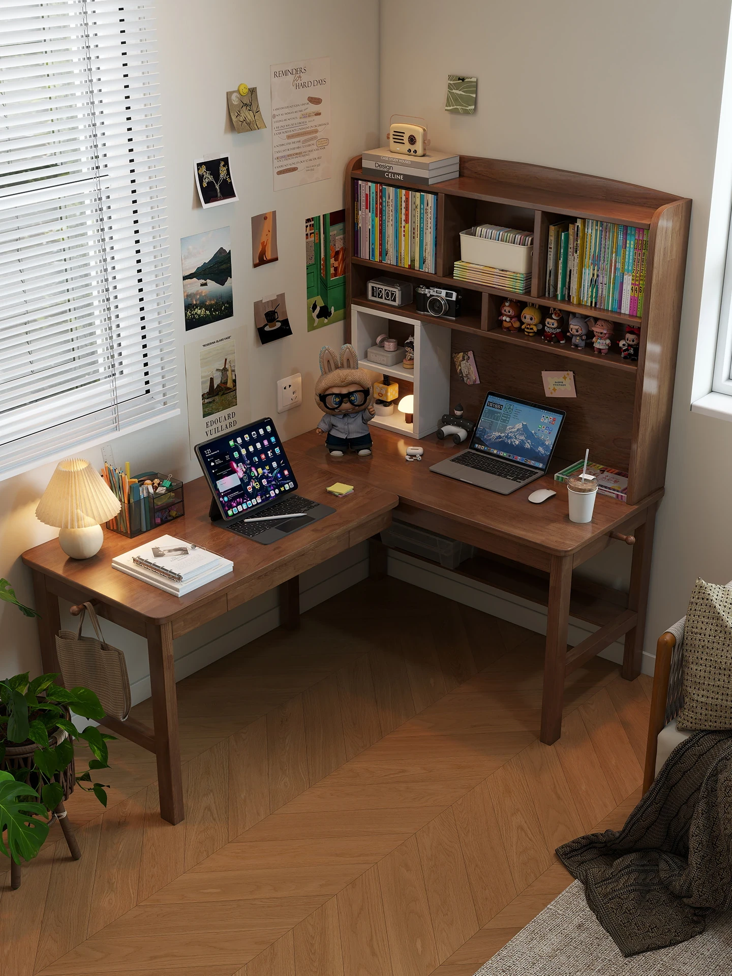 Solid Wood Corner Desk with Bookshelf - Space-Saving L-Shaped Writing Table for Home Office, Balcony, or Study - Perfect for Computer Work and Organization