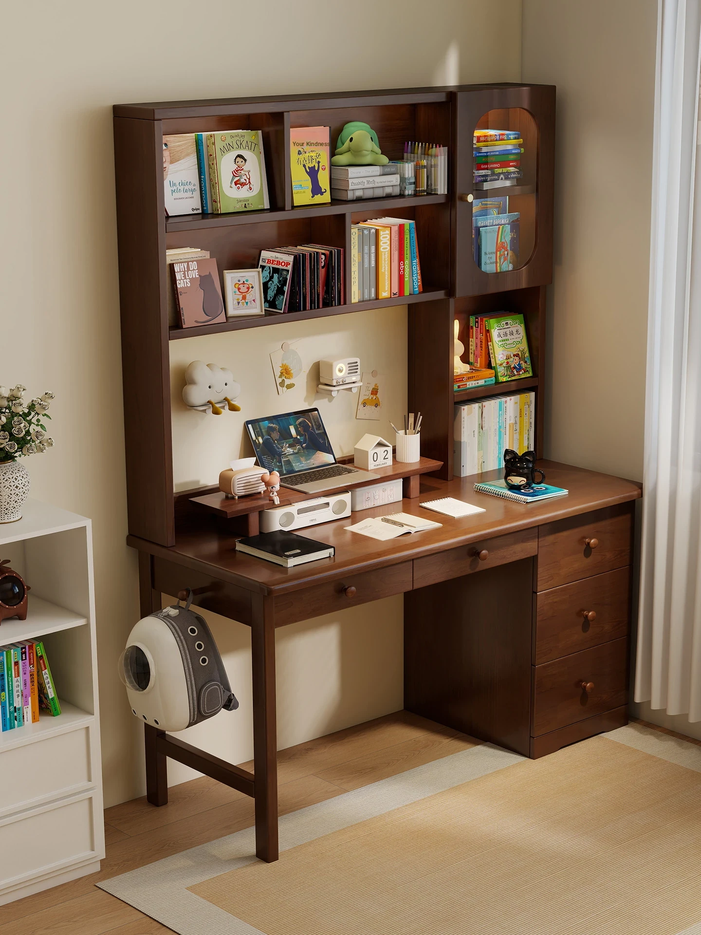 Solid Wood Desk with Bookshelf - All-in-One Student Writing Table, Study Desk with Drawer, Perfect for Computer Use and Balcony Settings