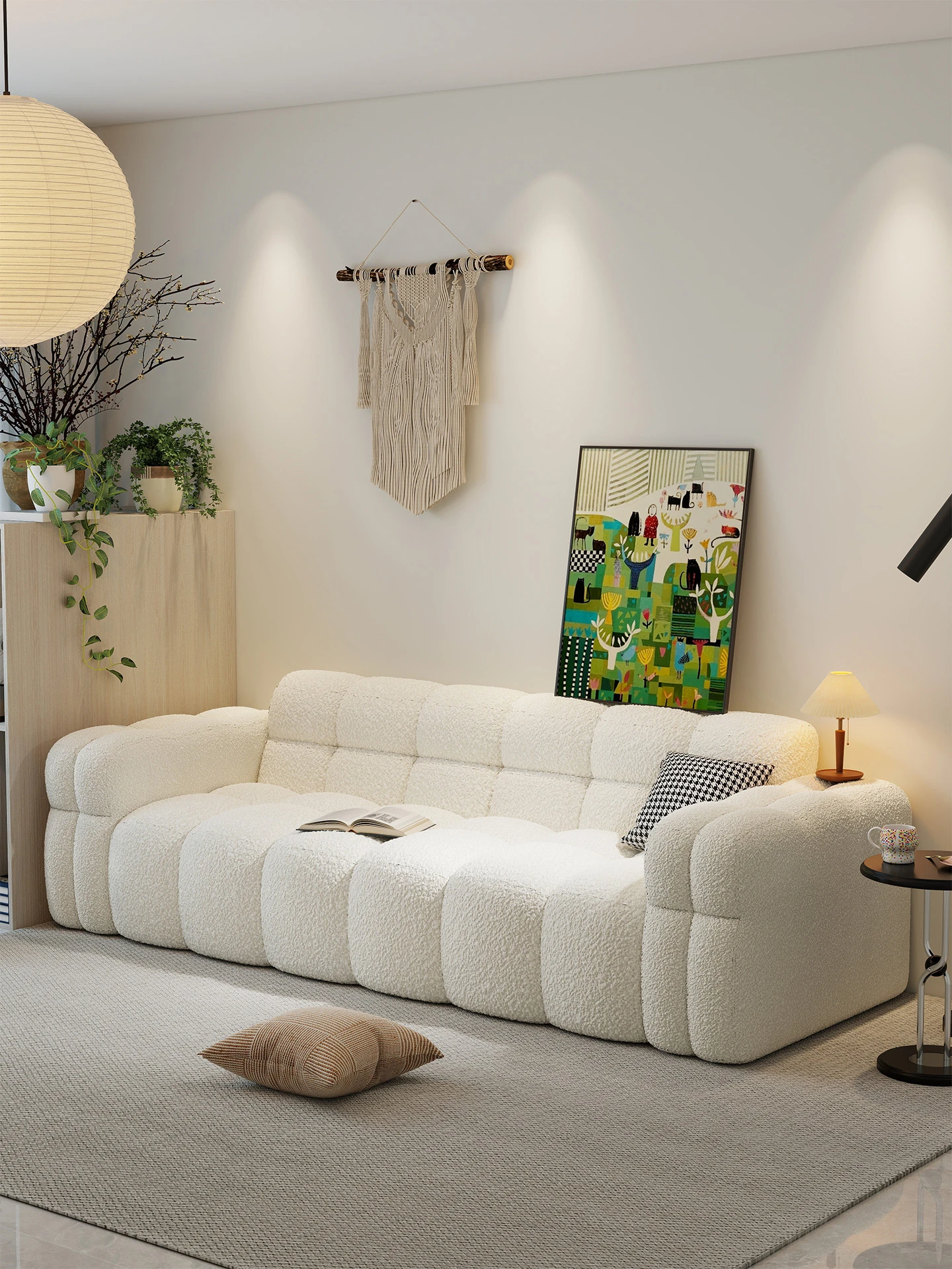 Creamy Lamb Fleece Sofa for Small Apartments - Minimalist Fabric Couch for Living Room, Double Three-Seater, Trendy Cotton Candy Style