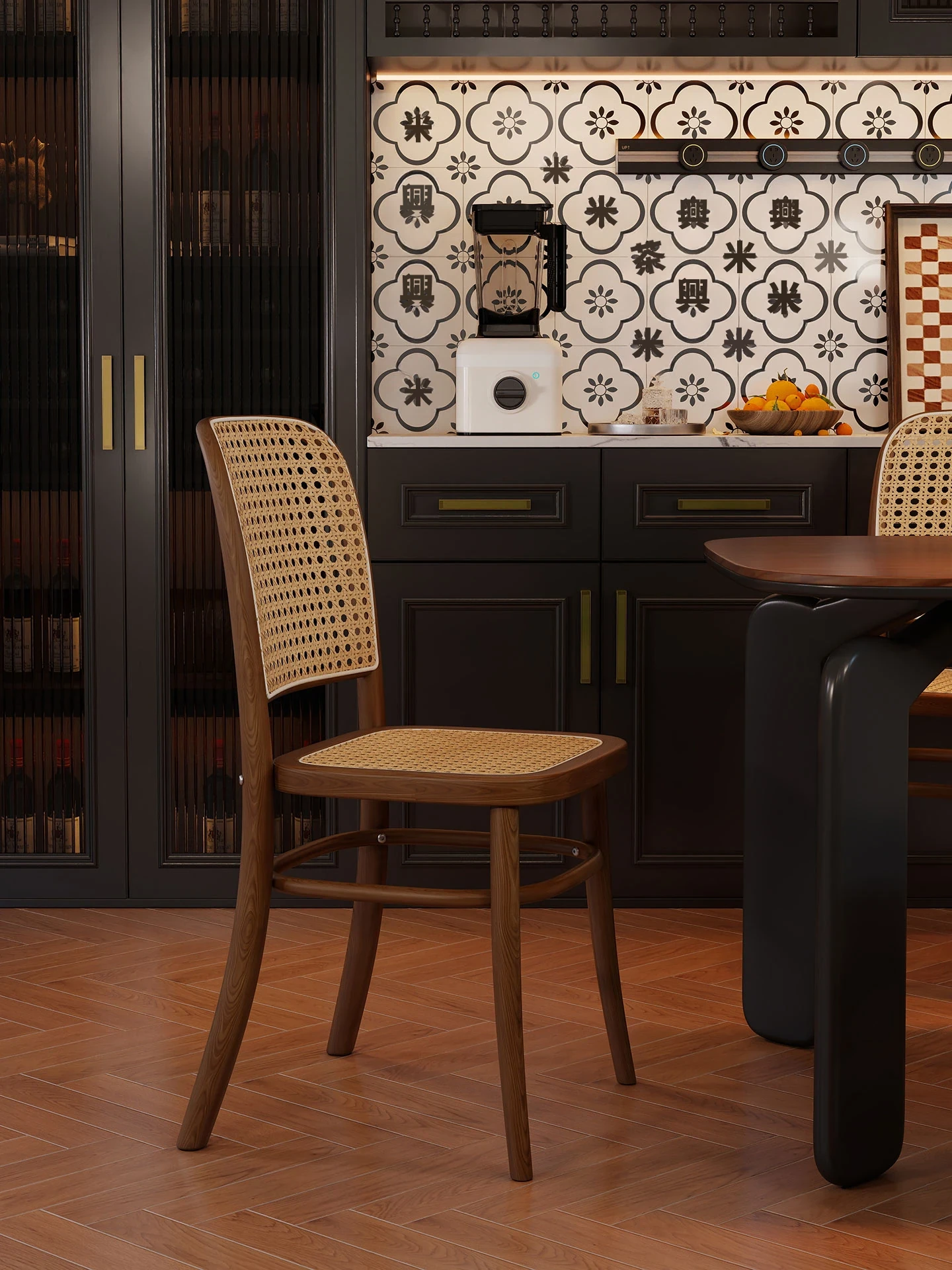 和風ミニマリスト丸型無垢材ダイニングテーブル|バルコニーに最適なレトロカフェスタイル|天然木とラタン編みのコンビネーション|おしゃれで温もりある家庭用食卓セット