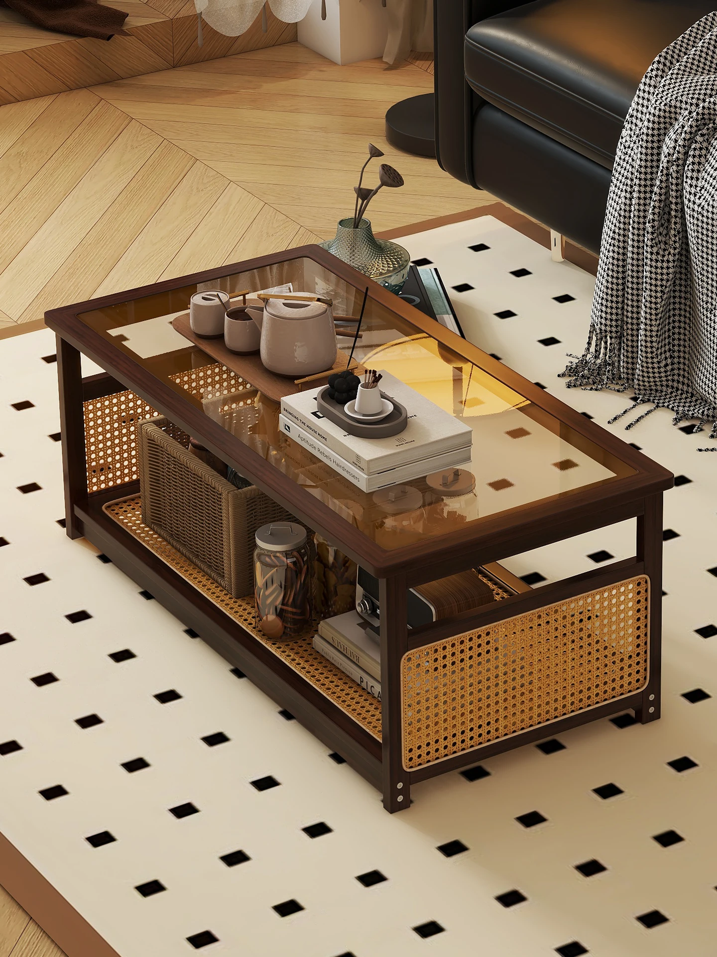 新作!藤編みのリビング用コーヒーテーブル - 長虹ガラス使用のシンプルでスタイリッシュな長方形ダブルレイヤーテーブル、小型住宅に最適!